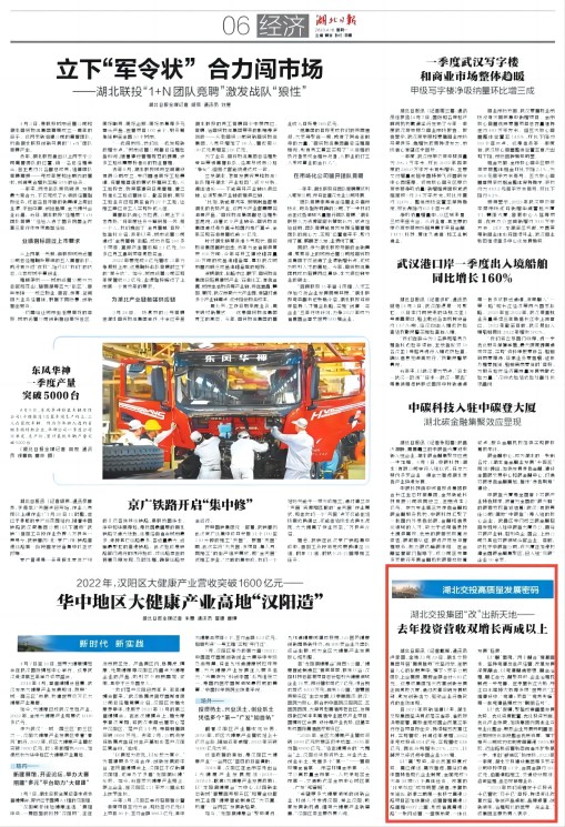 自2021年底新組建以來(lái),湖北交投集團堅決貫徹落實(shí)省委、省政府決策部署,高標準完成國企改革三年行動(dòng)各項目標任務(wù),持續釋放改革紅利,實(shí)現營(yíng)收、利潤逐年遞增,2022年完成投資554億元,實(shí)現營(yíng)收638億元,同比分別增長(cháng)21%、22%,以踔厲之姿邁進(jìn)中國企業(yè)500強。
