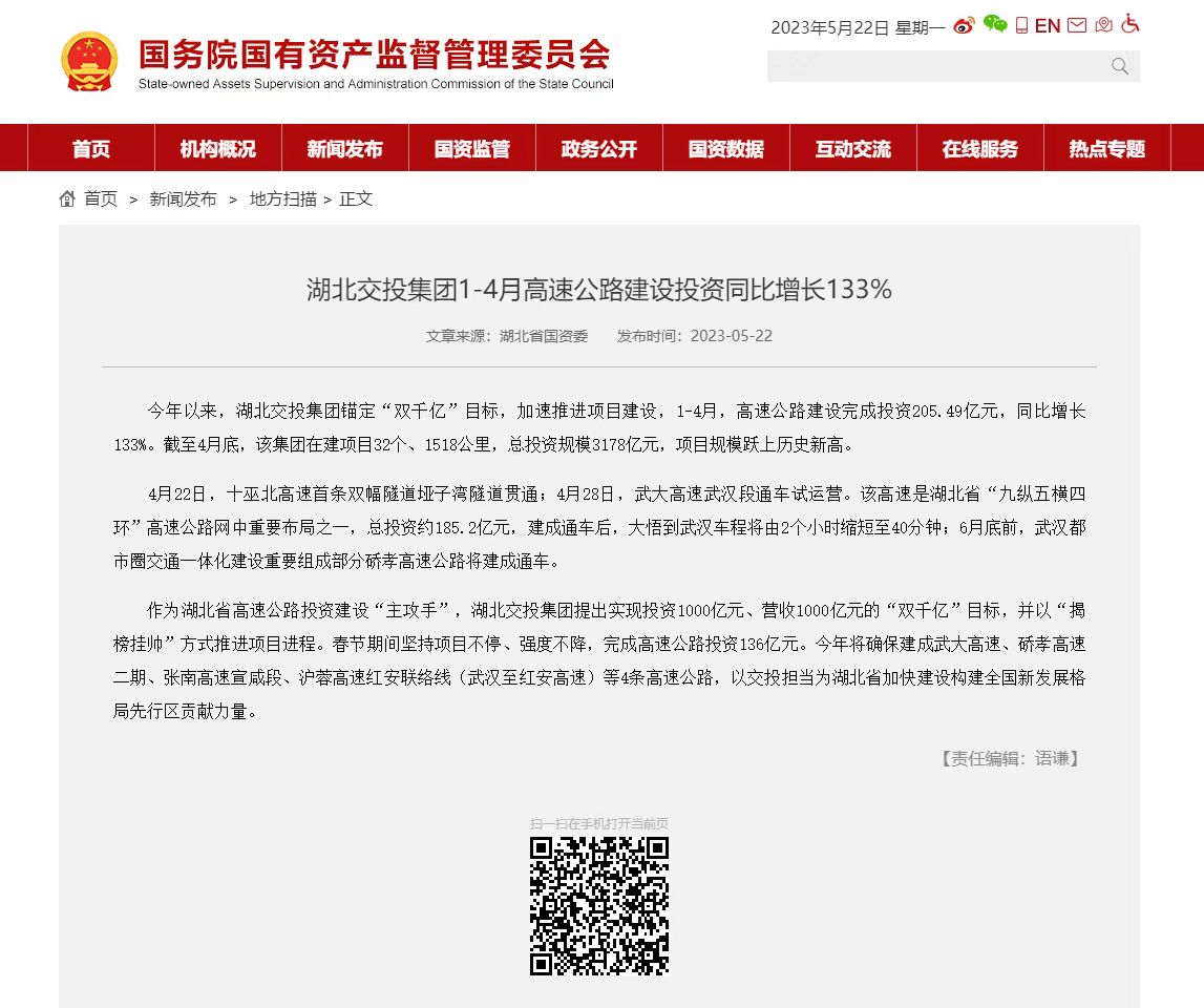 國務(wù)院國資委官網(wǎng) | 湖北交投集團1-4月高速公路建設投資同比增長(cháng)133%