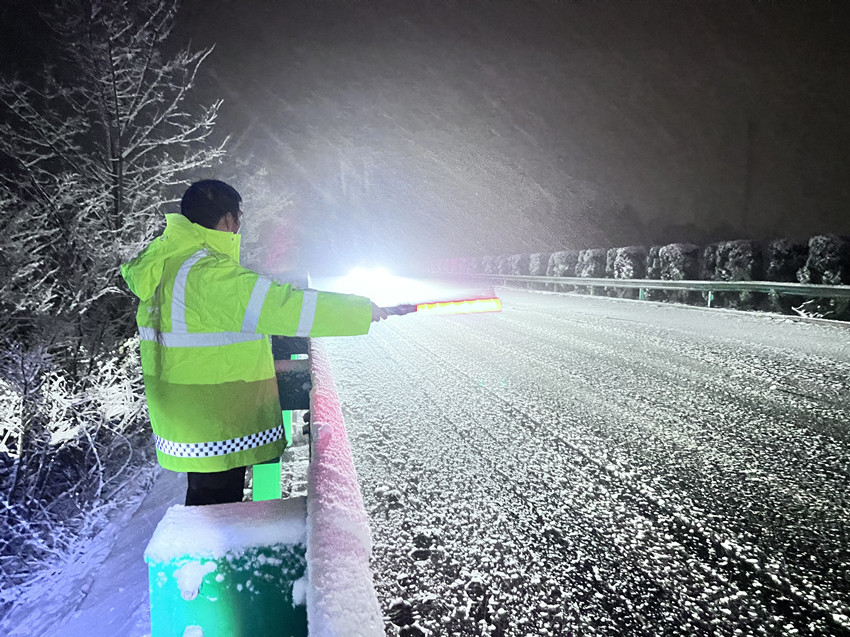 “已安排金龍轉換車(chē)道撒布機灑渝滬向至朱家巖,賀家坪應急點(diǎn)另上一臺撒布機正常撒布長(cháng)嶺至金龍?!?月22日凌晨,在海拔1000米的滬渝高速金龍隧道口,大雪中,身著(zhù)熒光綠的張文有條不紊進(jìn)行著(zhù)調度。針對部分橋隧及路面積雪的現狀,湖北交投運營(yíng)集團各公司綜合巡檢辦堅持“隨下隨清、雪停路暢”的原則,采取“機械為主、人工輔助”的除雪方式,科學(xué)調配人員和機械,重點(diǎn)加強對彎道、橋梁、隧道口、長(cháng)大縱坡路段等重點(diǎn)部位撒布融雪劑,全力清理積雪,保障沿線(xiàn)道路安全暢通。同時(shí),湖北交投集團通過(guò)沿路情報板、抖音號、微信公眾號等多種途徑,發(fā)布實(shí)時(shí)路況信息,提醒過(guò)往司乘減速慢行。