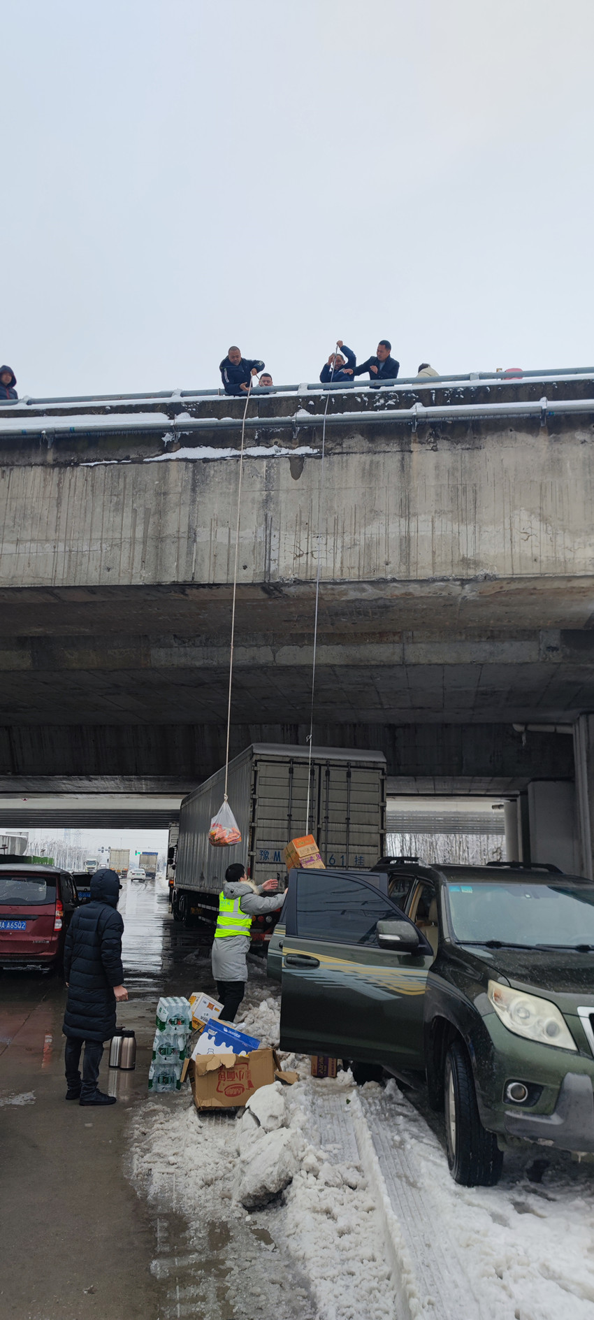 2月5日上午10時(shí),兩輛福州開(kāi)往豐都的大巴客車(chē)被滯留在東西湖南大橋,京港澳改擴建公司收到滯留在路上的乘客王先生求助電話(huà)后,迅速安排車(chē)輛滿(mǎn)載物資,陸續為被困群眾送來(lái)35箱方便面、10箱面包、20箱礦泉水,感冒藥等急需品。為解決橋上橋下運輸困難問(wèn)題,黨員突擊隊隊員蔡勤峰、孫堯飛找周邊的村民借來(lái)繩索,采用最原始的方式,為他們帶去了便利和溫暖,解決了被困群眾燃眉之急。王先生感動(dòng)不已:“這真是雪中送炭,天這么冷,要不是咱湖北老鄉幫忙送食物,還不知道困到什么時(shí)候呢,感謝你們,為你們點(diǎn)贊!”