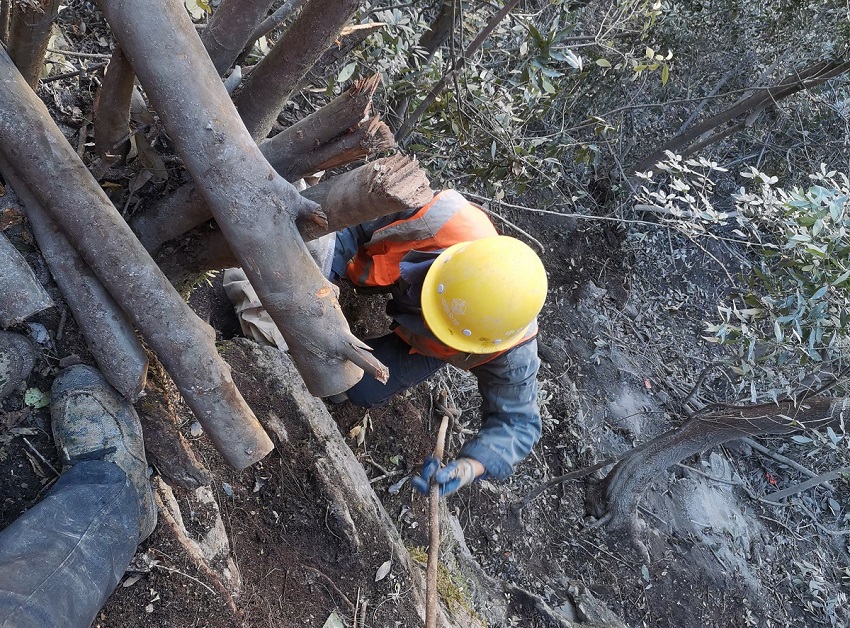 面對如此艱難的建設環(huán)境,要修建一條5.77公里的施工便道談何容易?為此,五標項目部組織技術(shù)員反復對現場(chǎng)地形進(jìn)行踏勘。測量人員在當地老鄉帶領(lǐng)下系著(zhù)安全繩,帶著(zhù)小洋鎬、鏨子、錘子等工具,在近乎垂直的陡坡上,一點(diǎn)一點(diǎn)敲打著(zhù)堅硬的山巖,硬生生地開(kāi)鑿出一個(gè)個(gè)淺淺的臺階,以供踏足前進(jìn)。他們用雙手扒著(zhù)巖面來(lái)往于作業(yè)平臺和便道之間,測定主線(xiàn)位置,并最終確定5號便道的可行線(xiàn)路方案。